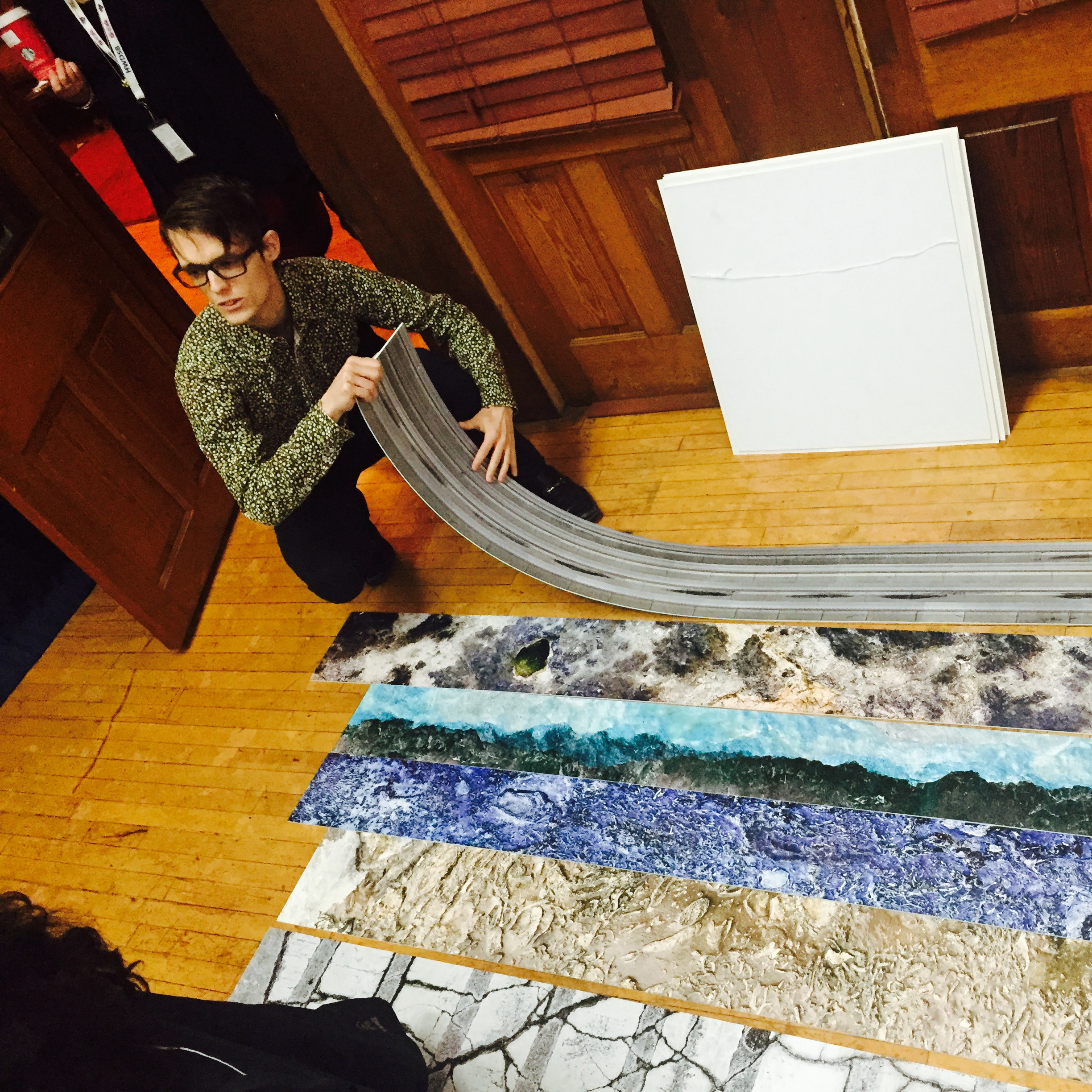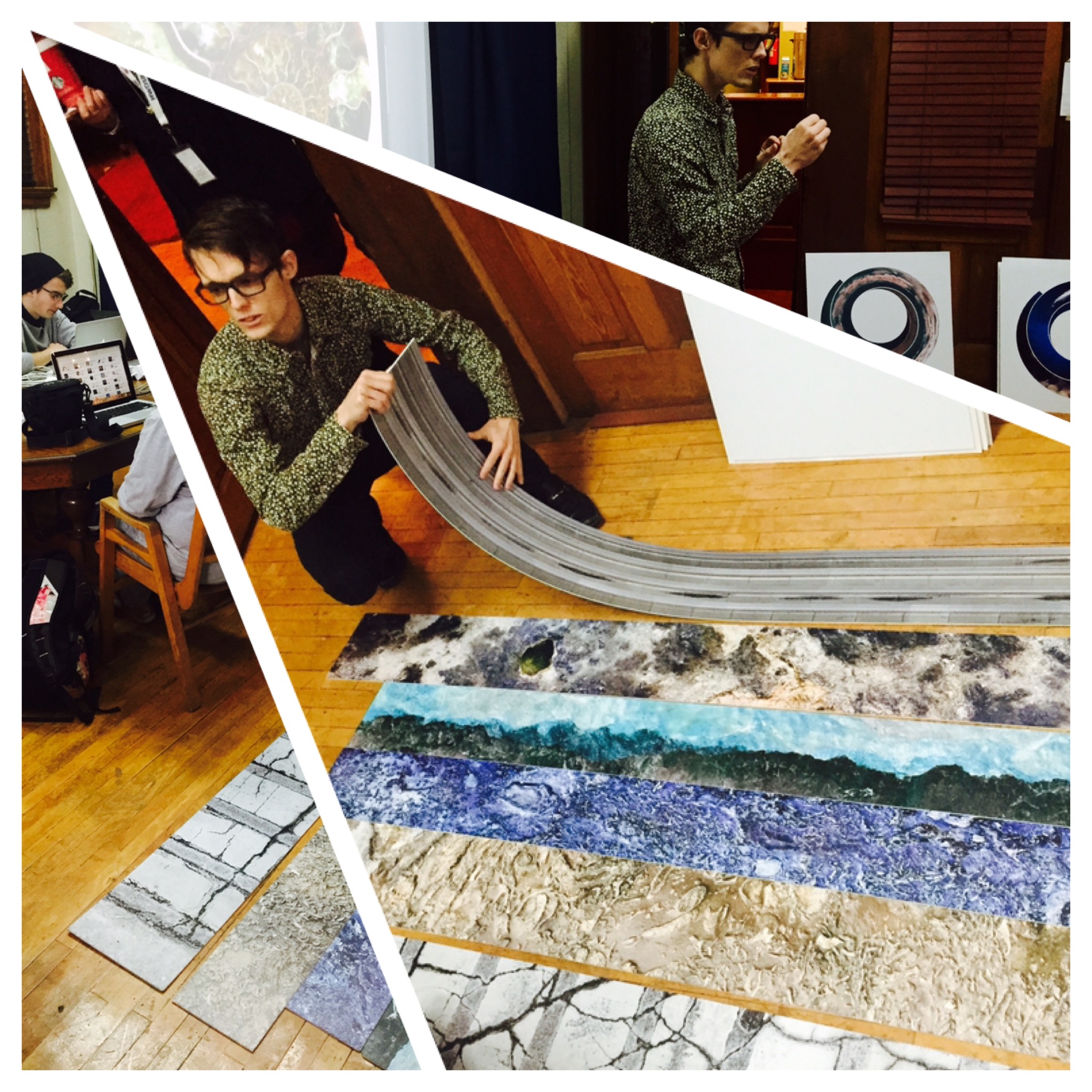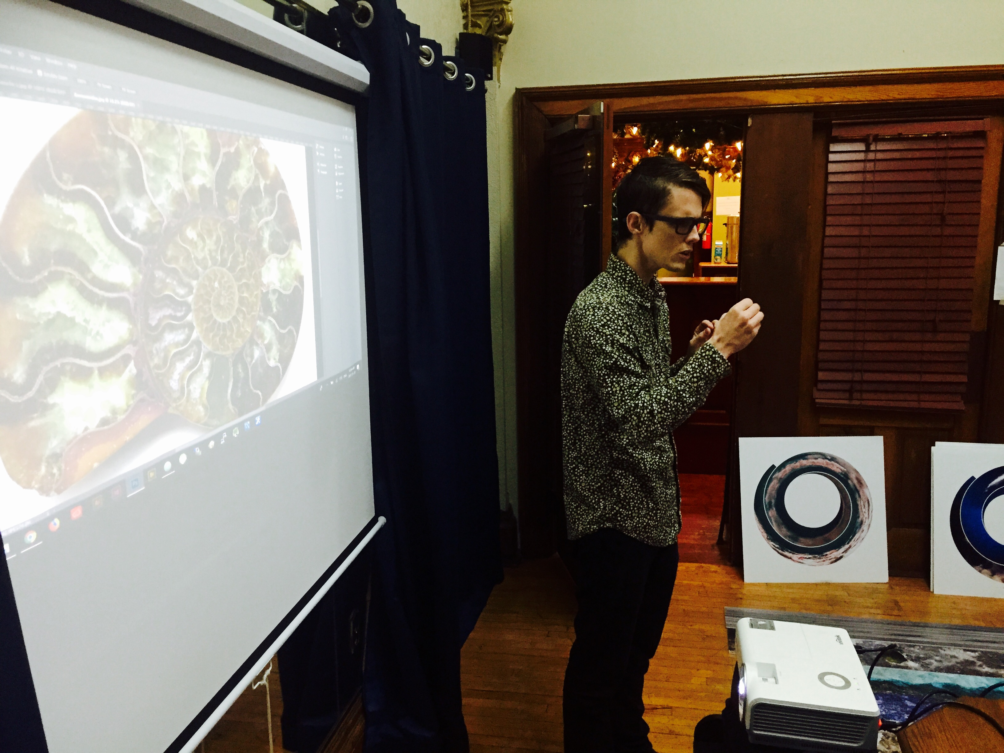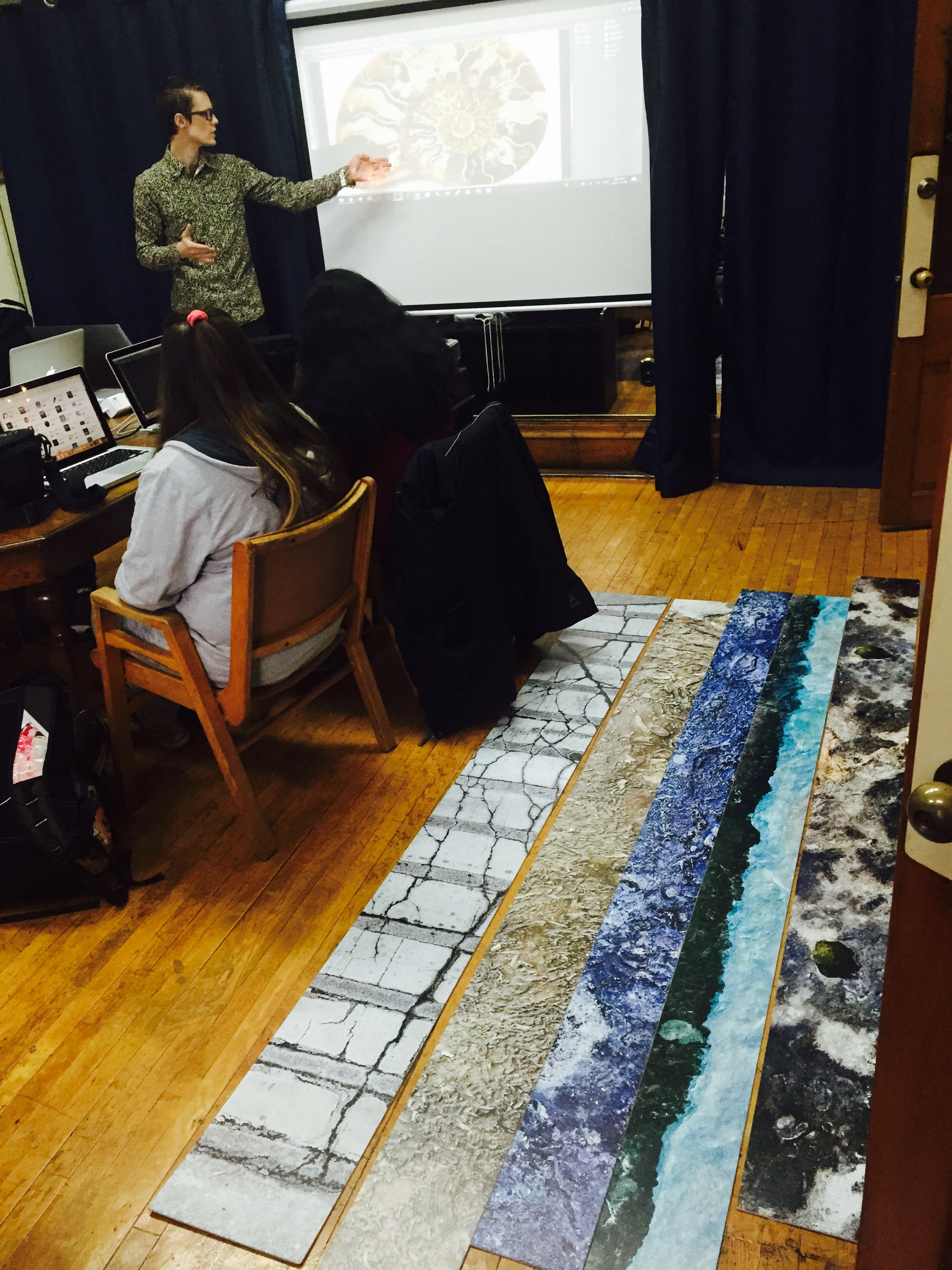 We explored relationships between natural processes (erosion, weather, tectonics, etc.) and computer algorithms. Students created photographic panoramas in the neighborhood, and then converted them into spirals using a Photoshop script. I brought in my work from two exhibits – Cloud Storage and Rock Bands – as object lessons in “spiralizing” i.e. how do you make a straight line into a spiral? We took our cues from a fossilized Ammonite shell, in which each successive partitions was slightly larger than the one before. The photoshop script we used followed the same pattern. While the shell formed over the course of eons, we were able to create a gallery of spirals together in a couple of hours! Thanks to the students, for their creativity, to the HWDSB for their provision of laptops and software, and to HCA for hosting.