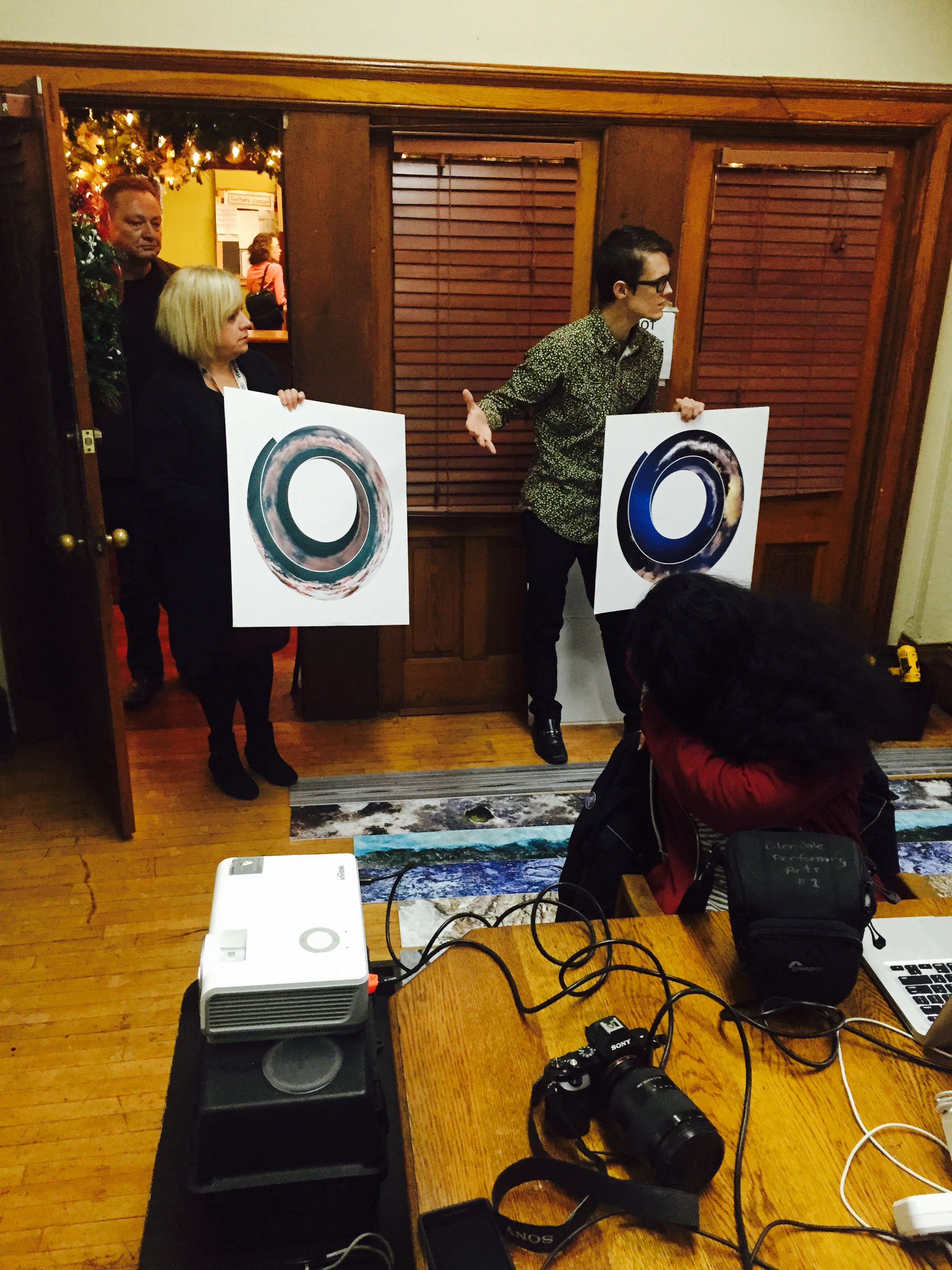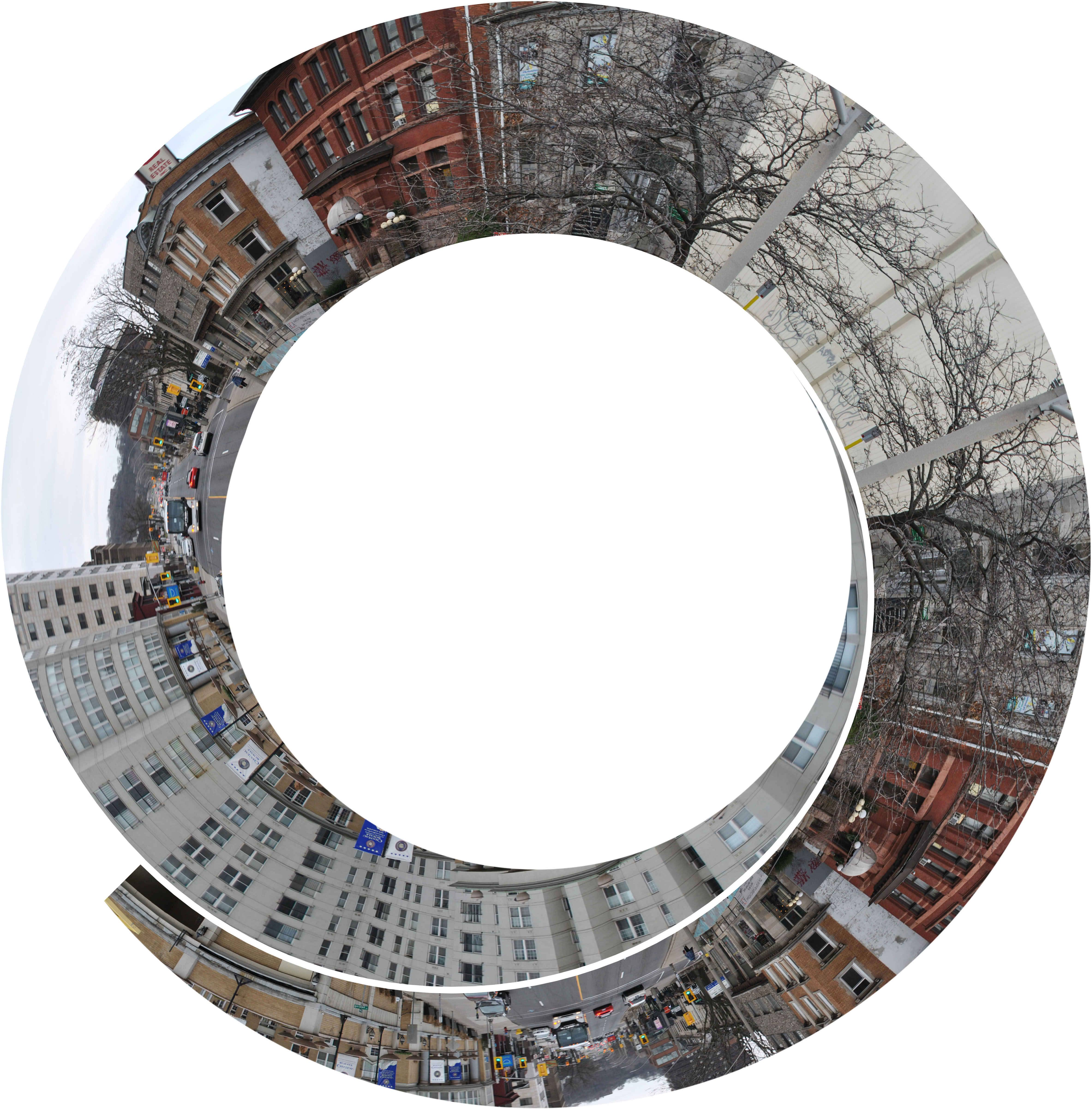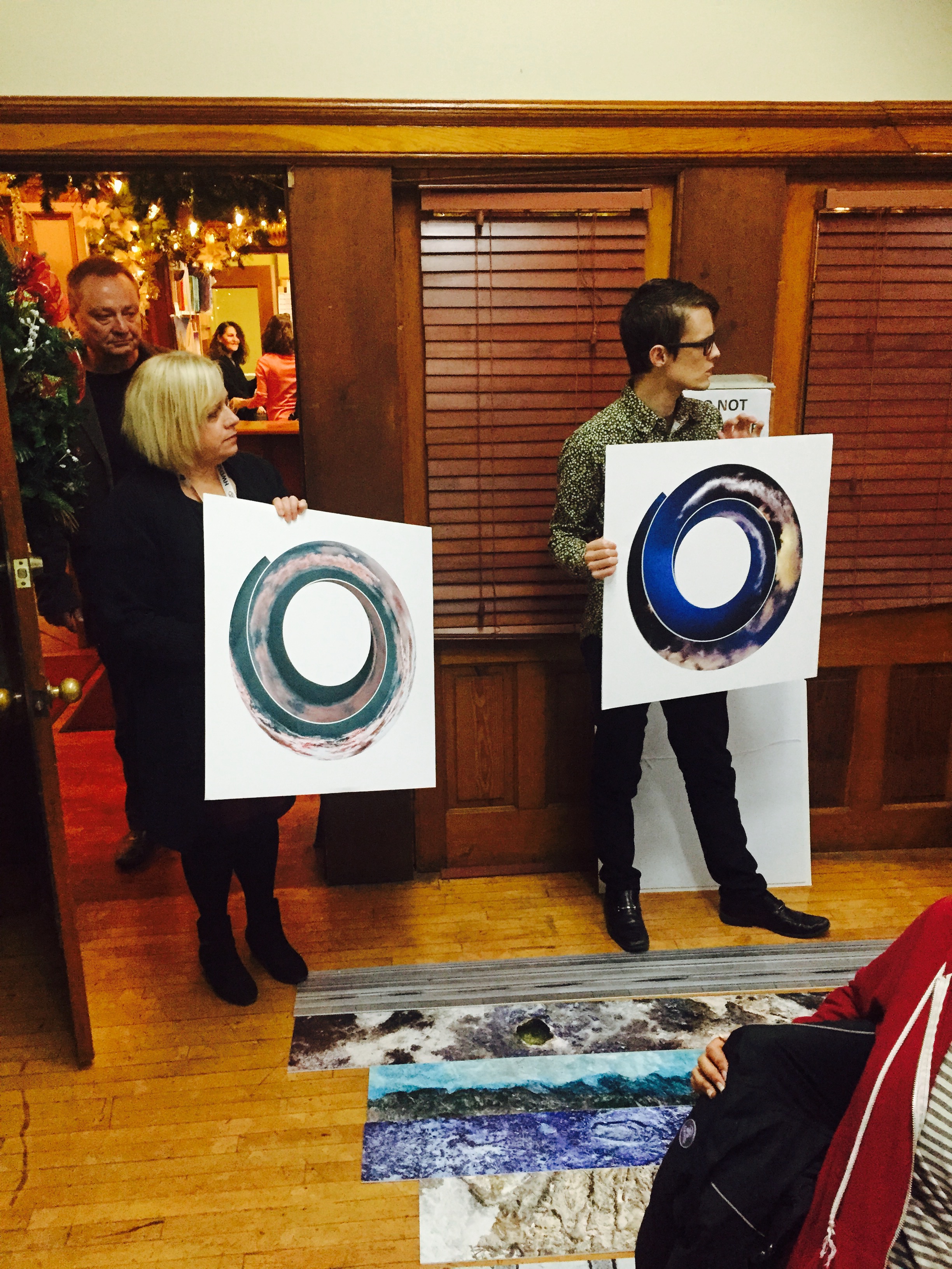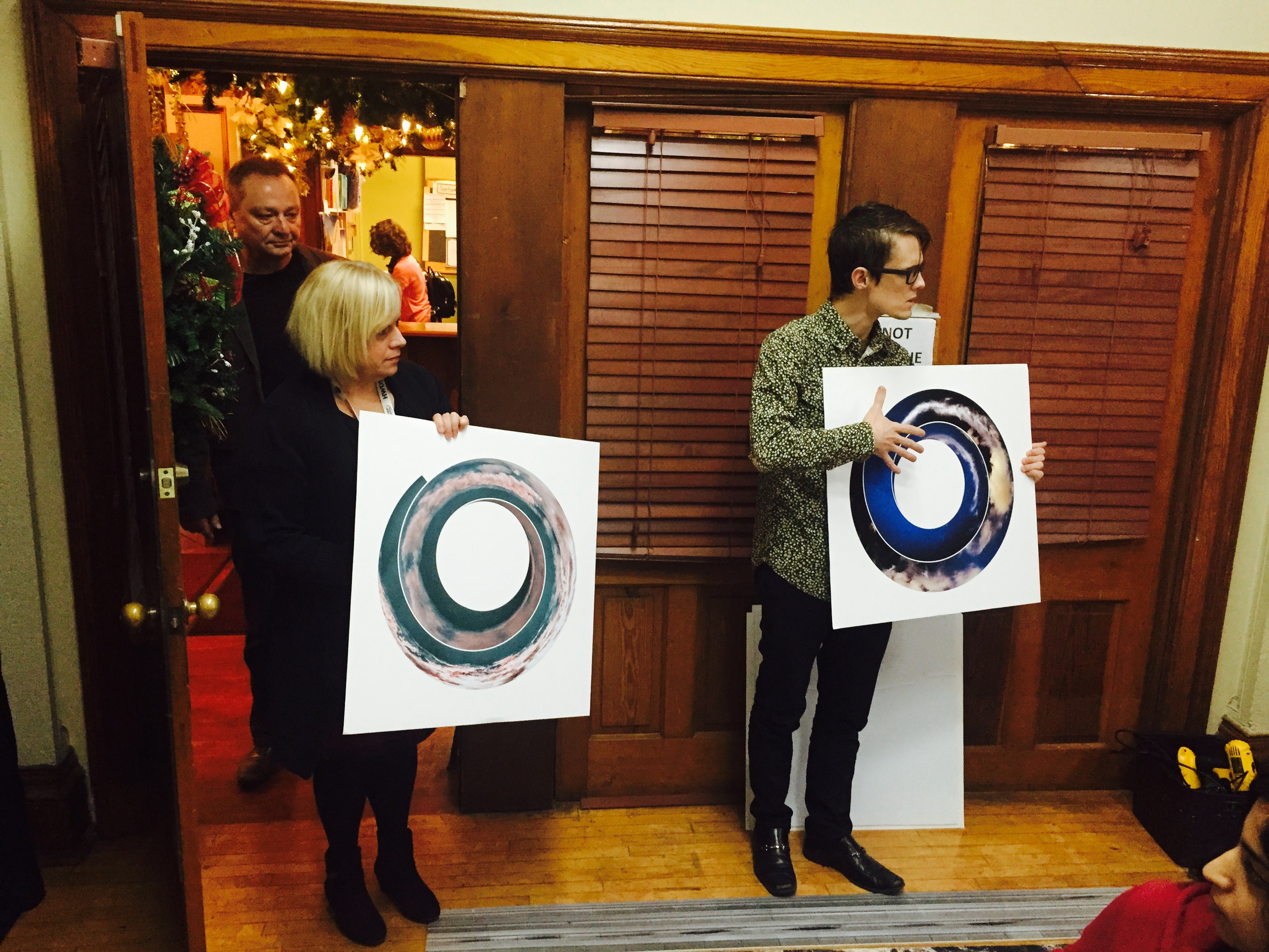 We explored relationships between natural processes (erosion, weather, tectonics, etc.) and computer algorithms. Students created photographic panoramas in the neighborhood, and then converted them into spirals using a Photoshop script. I brought in my work from two exhibits – Cloud Storage and Rock Bands – as object lessons in “spiralizing” i.e. how do you make a straight line into a spiral? We took our cues from a fossilized Ammonite shell, in which each successive partitions was slightly larger than the one before. The photoshop script we used followed the same pattern. While the shell formed over the course of eons, we were able to create a gallery of spirals together in a couple of hours! Thanks to the students, for their creativity, to the HWDSB for their provision of laptops and software, and to HCA for hosting.